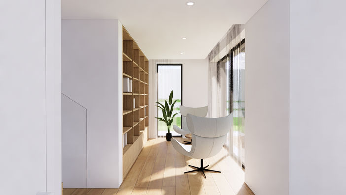 Nočná zóna pre všetkých členov rodiny je umiestnená na ustúpenom poschodí s odvetranou drevenou fasádou, kde hlavná spálna užíva najväčší benefit výhľadov priamo cez veľké presklenné plochy alebo z pohodlia strešnej terasy s privátnou jakuzou a bioklimatickou pergolou.